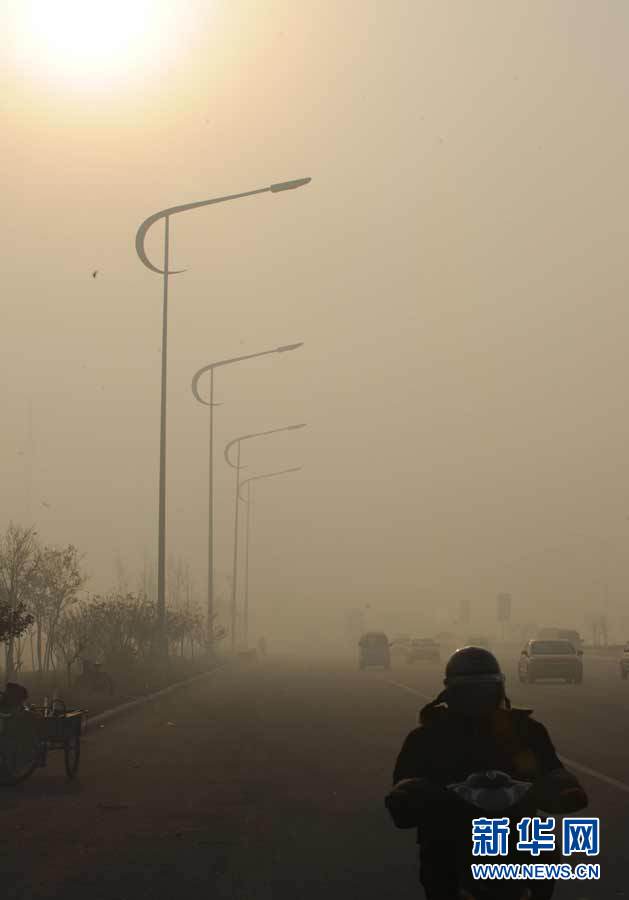 11月19日,一名市民在雾中骑车前行。当天,一场大雾弥漫天津市区,由于能见度偏低,导致京沪高速天津段和津塘等高速路段封闭。新华社记者岳月伟摄