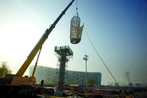 昨日,鸟巢奥运主火炬在鸟巢北广场进行吊装。记者 秦斌 摄
