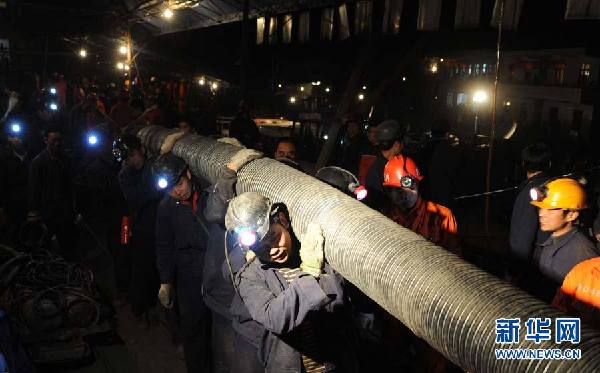 资料图片:11月21日,救援人员在紧张救援。当日11时许,四川省内江市威远县八田煤矿发生一起透水事故,28人被困井下。截至记者发稿时,井下被困工人伤亡情况不明。新华社记者江宏景摄