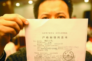 11月24日,平安府酒店,陈华(化名)的丈夫手拿尸检知情同意书。本报记者 王申 摄