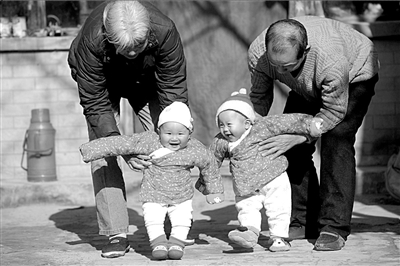 两名孩子在爷爷奶奶帮助下开始学步。记者张沫摄