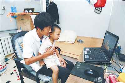 2010年8月,在青岛一建筑工地,一位年轻的农民工和弟弟在宿舍里用笔记本电脑看电影 杨登峰 摄