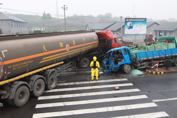 车祸发生在当地320国道安仁铺村路口,相撞的三辆车分别是满载30吨乙丙胺的槽罐车、满载水泥的卡车和装载玻璃的拖拉机,事故造成其中2名驾驶员受伤、槽罐车内乙丙胺泄漏。