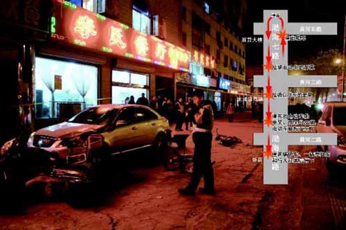 在黄河三路以南的大观园商场附近,刘某又将骑自行车的女子姜某撞伤。在继续向南逃窜的过程中,刘某将骑乘电动车的贾某、商某母女俩撞飞,轿车拖着电动车向南行至黄河二路以南时,又撞上两辆轿车及一辆摩托车,最后停在一家饭店门口,其间还将路边的行人程某撞伤。