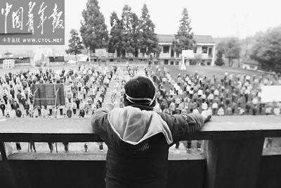 11月19日上午,湖南省张家界市永定区三家馆乡三家馆小学一名受伤的学生趴在教学楼上看同学做早操。这栋教学楼是1992年修建的,近20年来少有维修,显得十分破旧。记者 谢洋摄