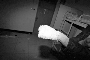 昨日,北京电子科技职业学院亦庄校区对面的宿舍楼里,一名学生伸出自己被打受伤的手臂。本报记者 吴江 摄