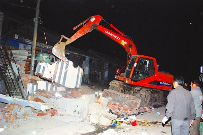 10月2日,国庆期间,南京雨花台区赛虹桥街道组织施工人员,连夜抢搭违建,给附近居民带来诸多不便,赛虹桥街道有关负责人解释说,这不是在搭违建,而是连夜在抢建“遮羞墙”,用于沿街出新。就此事,本报曾做过连续报道。昨天凌晨,赛虹桥街道城管科竟突然又偷偷将这处遮羞墙强行推倒。