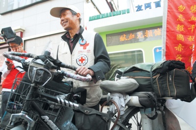 记者昨日看到,高永华的自行车可谓全副武装:不仅水壶、行李、修车设备等一应俱全,还特别携带了无偿献血的宣传资料。