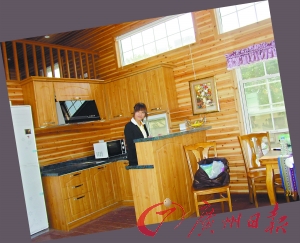 记者看到,所谓“移动房屋”就是一间用木材搭建的木屋,面积大约40平方米,外形与电视上常见的外国郊野村屋没有两样。“移动房屋”有三个款式,包括小公寓、酒吧、小餐馆。其中小公寓为两房一厅户型,客厅、饭厅、酒吧台、厨房、洗手间、主人房、客房配备完善,家电家具一应俱全。