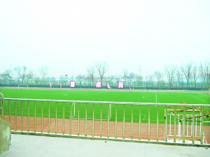 通过门向体育场内部望去,除看台一侧外,塑胶场地仍显得非常清洁。只不过挂在铁丝网上的标语,已被风吹落,只看得清“健……你……同”三个大字。