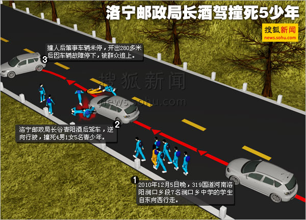 据通报,12月5日23时30分许,洛阳市洛宁县邮政局局长谷青阳,酒后驾驶黑色帕萨特牌轿车,沿S319省道(安虎线)由东向西行至79公里处(洛宁县涧口乡东村路段),逆向行驶与道路南侧多名行人相撞,造成洛宁县涧口乡中学3名初中生当场死亡,涧口乡2名青少年抢救无效死亡,并导致车辆损坏。