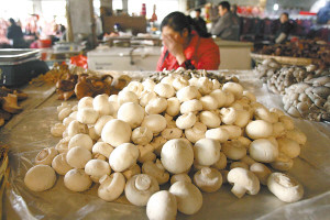 昨日(7日),沙坪坝区新桥农贸市场,一摊贩销售的蘑菇雪白光滑。资料图