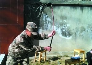 甘孜军分区独立营战士演示扑火过程。他使用的,就是当地的主要灭火工具“塑料拖把”。