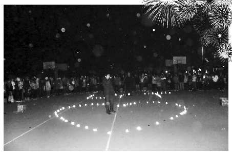 据该校大二女生蓓蓓(化名)回忆,当晚9点30分许,她正和舍友去操场健身,忽然听到一群男生在大声喊,好奇地过去一看,发现在一号女生宿舍前,有一二十名男生燃放烟火,向女生宿舍喊话。男生们还用酒精灯在小半个篮球场大的空地上,摆出“心”形。求爱“男主角”站在其中打电话。