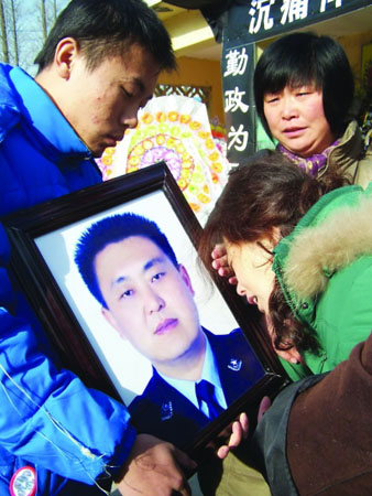 花圈、挽联、黑纱……8日一早,盐城市鑫业家园外,在哀伤的气氛中,附近的千名群众自发赶来,在寒风中默默伫立,为一名英年早逝的警长送行。8时15分,当灵车缓缓驶去,人们注视着渐行渐远的车队,一些群众失声痛哭。这位警长名叫陈锐,盐城市公安局大洋派出所警长,因为连续多日加班,而突发脑溢血倒在工作岗位上,年仅42岁。