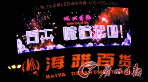 当晚8时整,南城鸿福路口人流穿梭,熙熙攘攘,周末时光,逛街休闲的市民明显比平时多了很多,就在这时,海雅百货大楼上的LED大屏幕突然中断正在播出的内容,随之出现一段浪漫求婚大片吸引了路人的眼球。