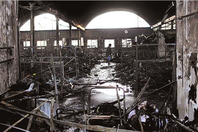 菜市场内被烧得一片狼藉。本报记者朱嘉磊摄