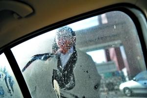 昨日,北太平庄派出所,当事律师在查看车玻璃上的脚印,他报警称深夜遭袭。本报记者杨杰摄