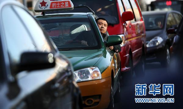 12月10日上午10时30分许,出租车司机在拥堵的车流中焦急地等待。新华社记者 万象 摄