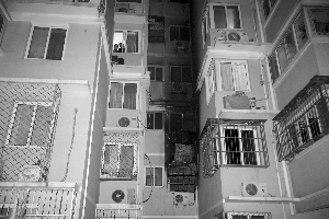 昨日,东直门内大街4号楼,起火房屋附近的外墙被熏黑。本报记者 王嘉宁 摄