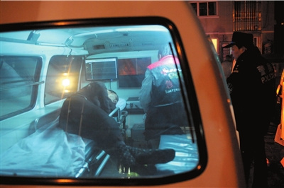 消防员从起火房屋内救出一名男子,将其送进急救车中。记者看到,该男子躺在车中,抱着双臂瑟瑟发抖,不时向急救人员手持的袋子内呕吐。