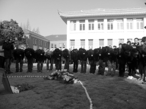 九点一刻左右,不少师生都聚集到了燕园。在这些前来悼念的人当中,包括了当时获救的18名探险学生中的16人。“另两人已在昨天前往黄山,在学校领导的陪同下,参加今天的张宁海悼念仪式。”校方一位老师告诉记者,这是这批学生第一次集体露面,之前因为此事给他们带来了巨大的压力,所以校方也在做相应的心理辅导。
