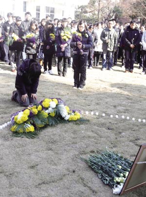 按原计划,悼念仪式是昨天(12月17日)上午九点半正式开始。但还没到8点,复旦大学学生会的成员就已陆续来到了悼念仪式举行地——燕园。他们在集合后便开始清扫燕园的草地;有的则用白色蜡烛在草地上摆成一个心形图案,并将张宁海的遗像放进图案中央;同时,在通向燕园世纪钟的石子路上,学生们还用黄色的康乃馨铺在路的两侧……