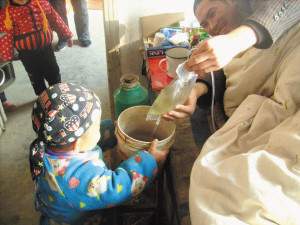 身高尚不足一米,言语也不清晰的董心怡对记者的到来并不怯场。在和其他同龄孩子玩耍时,也一样俏皮。但在董建设的病床前,三岁的她却格外听话。在董建设的吩咐下,她熟练地找来尿盆,将董建设导出的尿接走,并且麻利地倒在屋外的茅厕中……