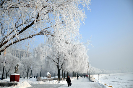 12月20日在牡丹江江滨公园拍摄的雾凇美景。新华社发(田成明摄)