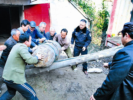 最大的航空炸弹系侵华日军遗留 8条大汉合力抬它上卡车