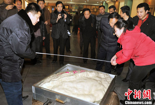 12月22日是中国的传统节气冬至,吃饺子是几千年来的传统习俗。河北保定曲阳县的郑记饺子馆特制了一个超级特大水饺。图为公证处人员在现场测量,进行公证。中新社发 刘向阳 摄