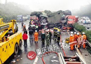 昨日(22日)凌晨,浓雾锁城,渝遂高速公路能见度不足20米。上午8时许,渝遂高速遂宁往重庆方向青木关路段发生多起车祸,2公里长的公路上,几十辆大货车、客车及轿车相继撞在一起,事故共造成5人当场死亡、10人受伤。