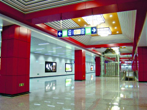 望京西站内,方立柱、仿古宫灯等色彩为纯正的“中国红”,顶部装修借鉴了中国古建的藻井形式。
