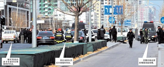 昨天上午11点,在朝阳区西大望路上,4辆警车前后夹击拦下一辆白色丰田皮卡车后,司机侯某称车上有爆炸物,警方在对峙一小时后突然砸坏车玻璃在两秒钟内将侯某控制。警方透露,侯某进京前在天津一加油站持械伤人,随后携带爆炸物逃窜进京。