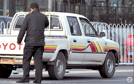 嫌犯驾驶的皮卡车右后侧玻璃被民警砸成Y字形
