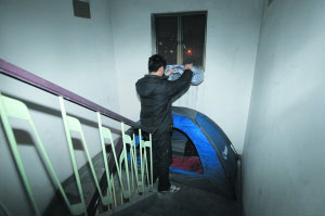 “选择顶层,是为了减少对住户的打扰。我一般在晚上11点之后才回来,悄悄地睡下,所以基本不会对他们造成影响。”赵铭熟练地打开包裹,先将帐篷斜着铺在楼道的台阶上,然后将金属支架一段段接好,穿进帐篷内,帐篷慢慢地鼓了起来……“我每晚睡前都会做一遍这个工作,大约花费15分钟。天亮外出时,重新收好,放到保安室内。”
