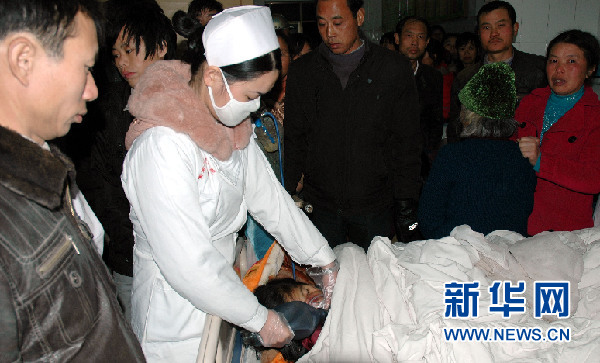 12月27日,医护人员正在抢救受伤的孩子。当日早晨,湖南衡南县松江镇一辆由东塘村开往因果村的三轮车运送20名小学生,在驶到因果桥时,发生交通意外,整车坠入河中。截至目前,遇难人数已上升至14人,其他6名受伤学生正在医院接受救治。新华社记者 韩曦乐 摄