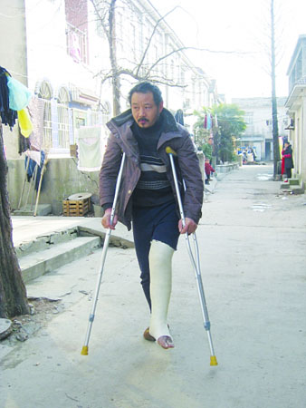 张峰吃力地行走在接记者的路上。