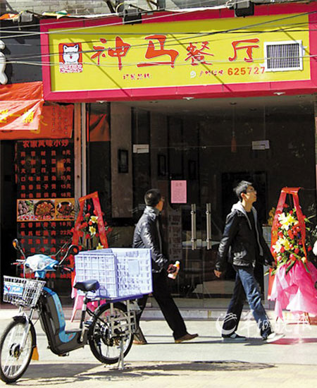 网络流行语“神马都是浮云”走进了现实。26日,广东外语外贸大学北门的丛云路上,两个大四毕业生开的“神马餐厅”开张,宣称“神马最给力?神马餐厅最给力!”