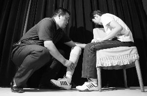 小皮的父亲正在给女儿戴假肢。2007年,小皮出车祸飞兰州治疗,遭拒延误治疗右腿截肢。本报资料图片 浦峰 摄