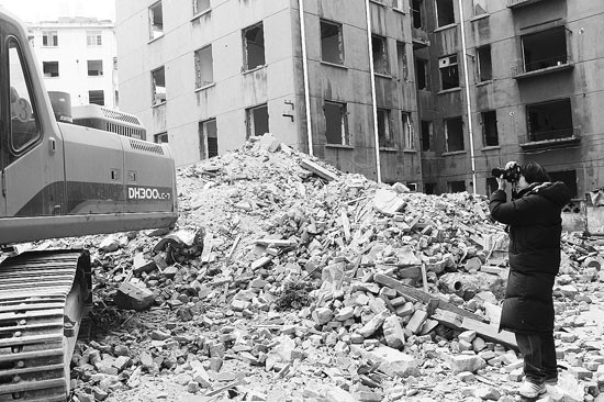 一辆正在作业的挖掘机最先进入王国栋的相机取景框,现场尘土飞扬。这个庞然大物是2010年的最后一天下午开进楼前空地的,此刻,它正试图将自己垫高,驶向南向侧楼——该楼内已全部搬空。