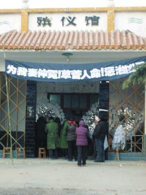 “没有的事,我们从来就没接受这一说法。”李莉生前的一名邻居摇头对记者说。他指着殡仪馆门口悬挂的写有“草菅人命,惩治凶手”等黑色大字的白色横幅介绍说:“我们在殡仪馆住了三四天了,就是希望能够有一个公道的说法,希望能够惩治凶手,告慰死者。”