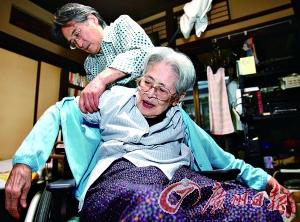 日本东京,孝顺的儿子为93岁的老母亲套上毛衣。