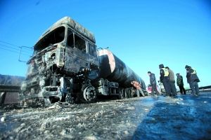 昨日,事发油罐车烧得只剩铁架,救援人员正进行安全检查。本报记者 王嘉宁