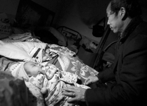 老人抚摸一对龙凤胎孙子孙女。因妻子生产后身亡,孙雪峰将两家医院告上法庭。昨日,该案进行了鉴定质证。记者 吴江 摄