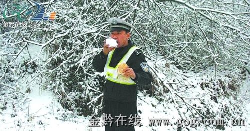 在网上一组专题报道中,标题为《贵州遵义交警抗凝冻,啃雪坚守岗位》的系列照片,引起了网民关注。其中有交警在道路上设卡值勤,也有交警帮过往司机推车的情景,而一张交警“啃雪”吃面包的照片,尤其让人印象深刻,至今已有1108条评论。记者注意到,照片中的交警脸被冻得通红,他左手拿着面包,右手拿着一团雪,正放在嘴里啃。