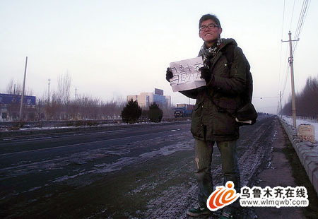 1月6日,天刚蒙蒙亮,在312国道哈密段3593千米处,胡蓓蕾展开写有“乌鲁木齐”的纸牌,微笑着在路边搭车。(本人供图)
