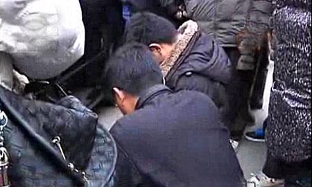 两小伙在小狗尸体前下跪。视频截图