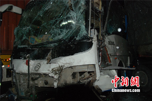 在这三辆车的附近,二辆大货车将一辆大客车挤在了中间,三辆车并排横在高速公路上。客车中间部位正好撞击在集装箱货车尾部,现场物品散落一地,地上到处都血迹斑斑,客车内有多人受伤且有40余人被困车内。