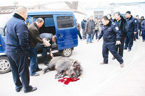 战斗已经打响,受到惊吓的野猪已经很难平静下来,而林业部门携带麻醉枪的工作人员依然没有到场,唯一的办法只能是使它失去反抗能力。此时,野猪已经沿着医院大楼东侧的通道,拐弯跑向了医院的北门。在大楼东侧,追击的民警连续开枪,其中几枪击中了它的前腿,野猪终于躺在了地上。随后,几名手持棍棒和绳索的医院保卫人员上前,试图将它捆绑。